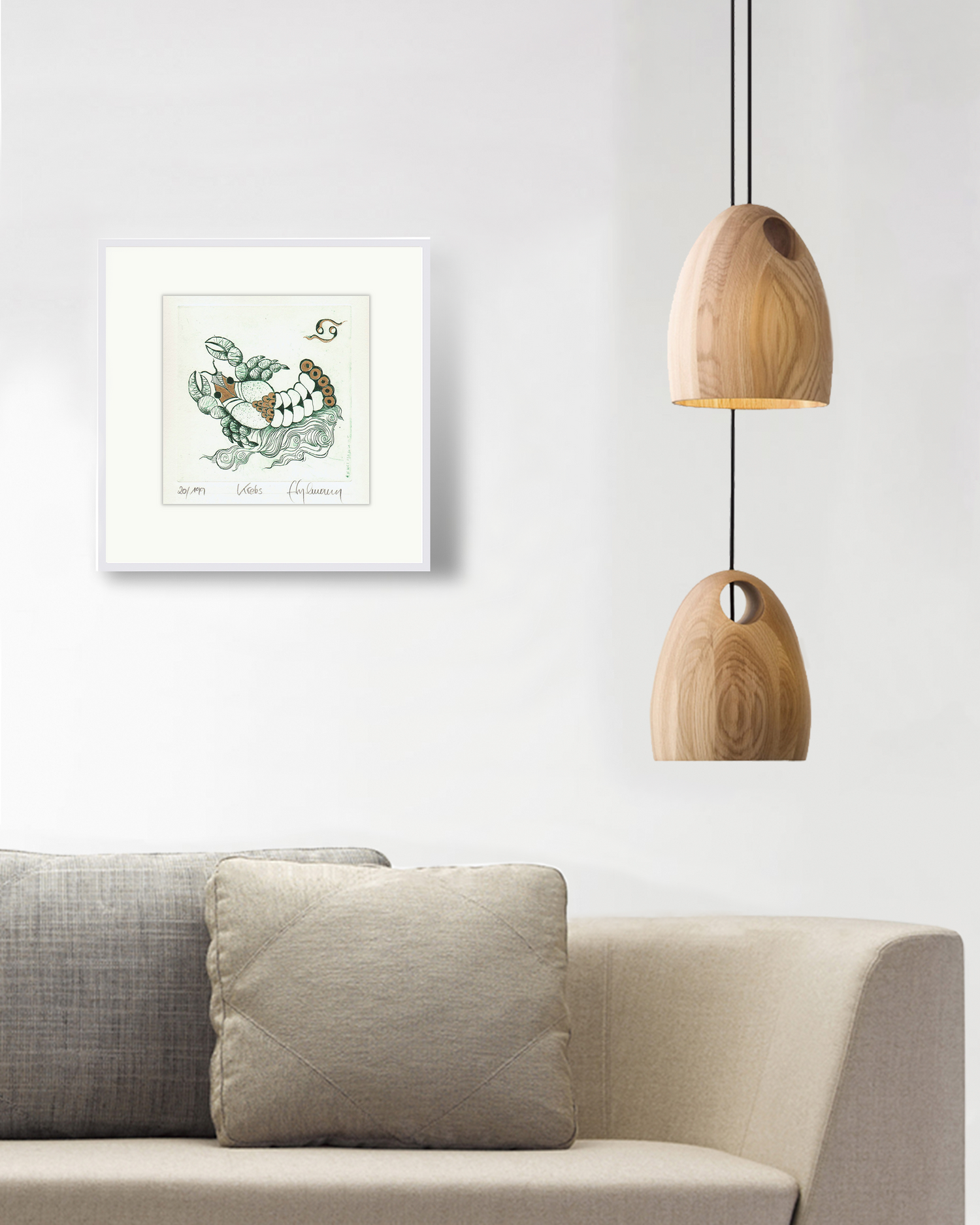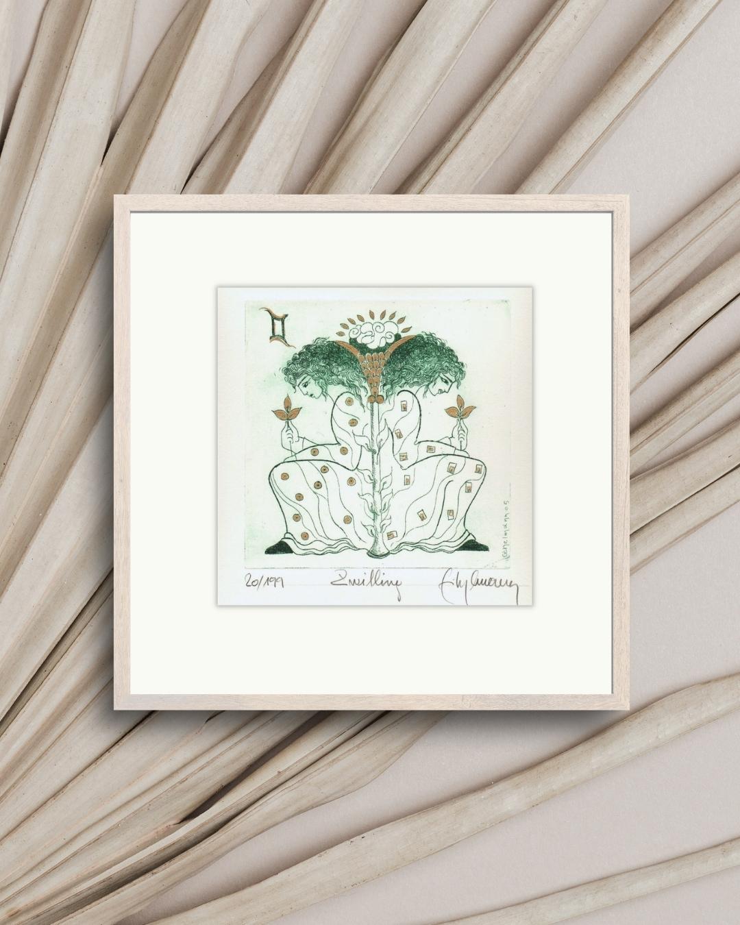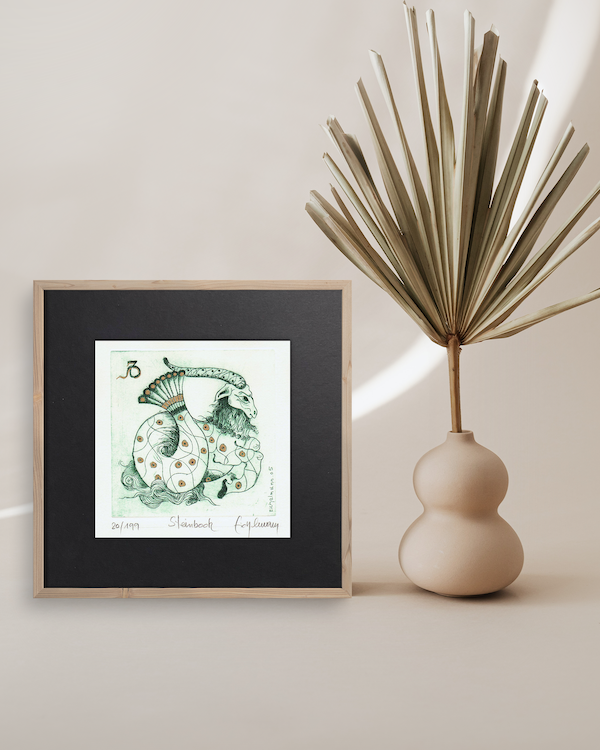 2004 entstanden die 12 Tierkreiszeichen als Radierung, handkoloriert mit Gold.